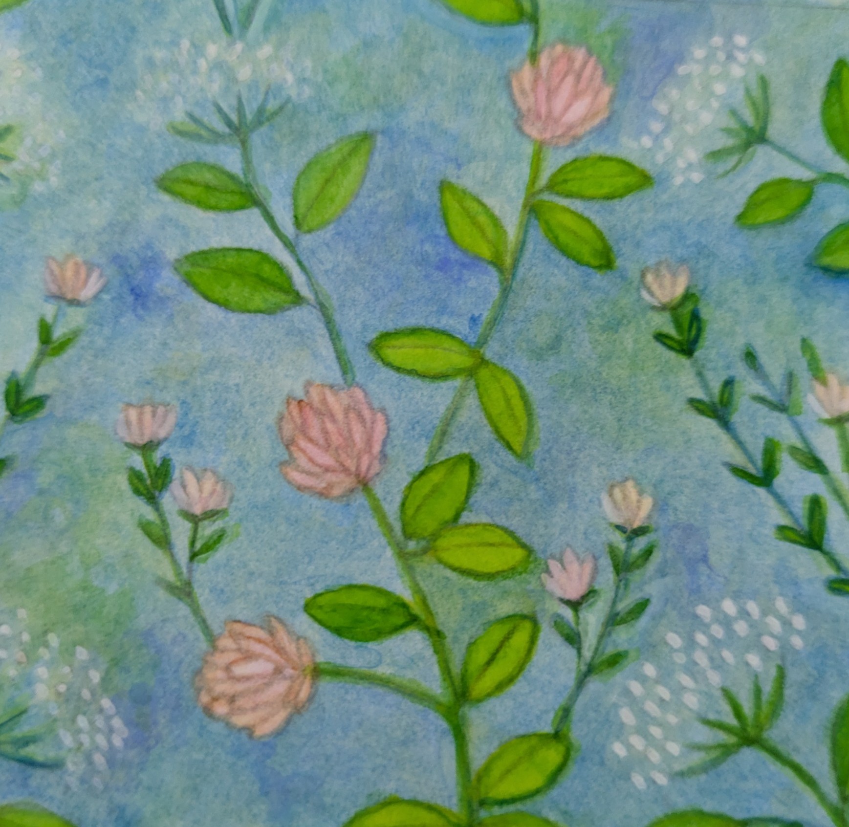 わたしは絵をかくときは、キャンバスに強く塗りつけるようにかくのですが、厚手の紙にかくときは、淡くて薄い色を根気づよく塗り重ねるのが好きです。