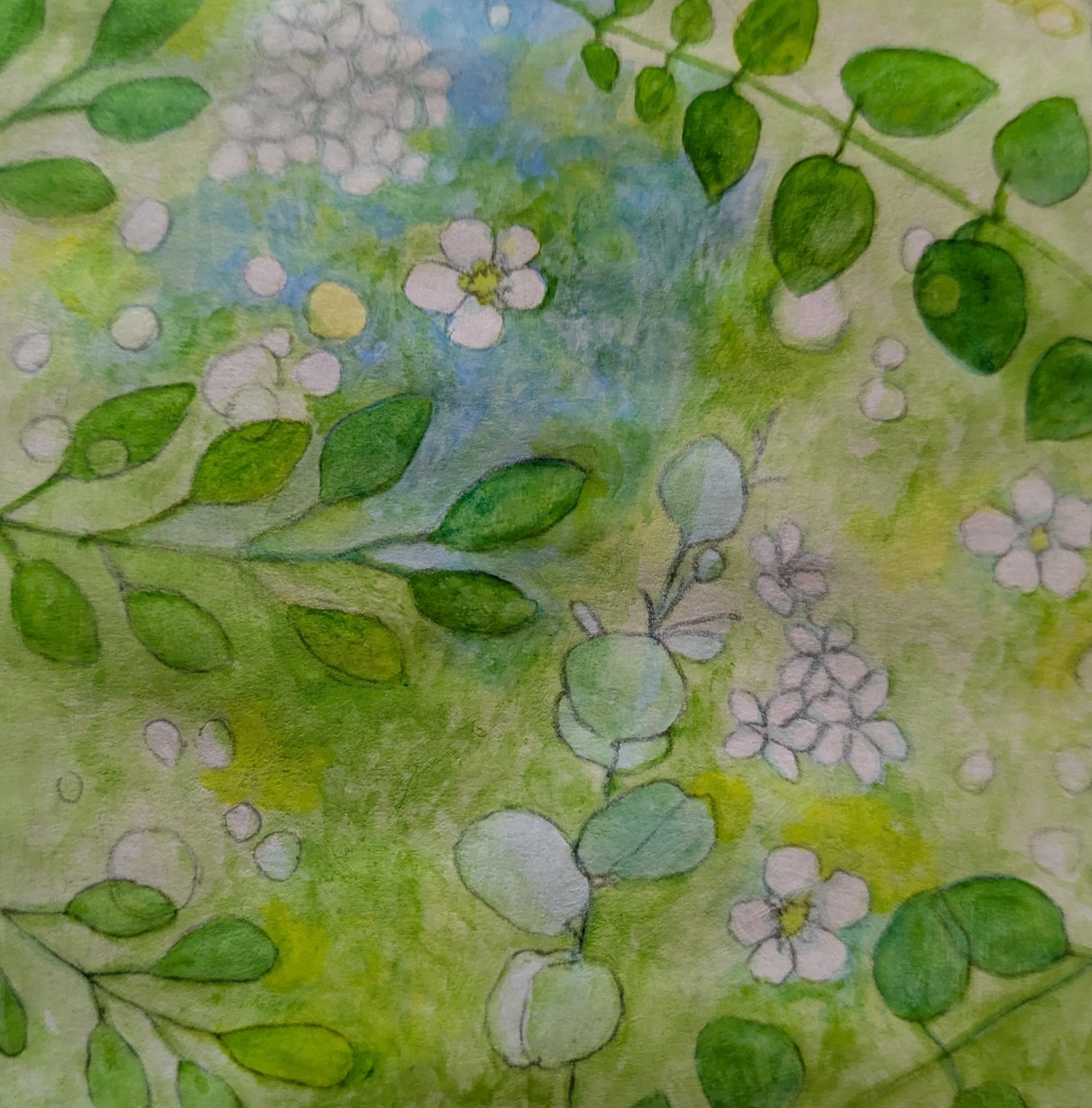 きょうはミニパネルを支持体にして、植物柄のアクリル画をかき始めました。